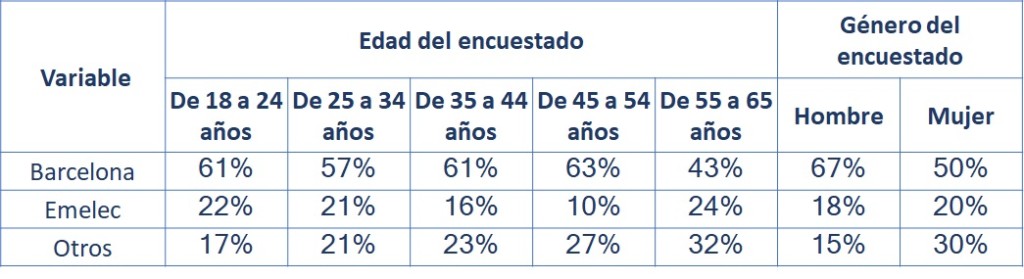 • 59% de los hinchas comenta ser hincha de Barcelona y un 23% de Emelec, solamente un 18% afirma ser hincha de otros equipos de futbol. Lo que confirma la aseveración popular de “la mitad más uno”.