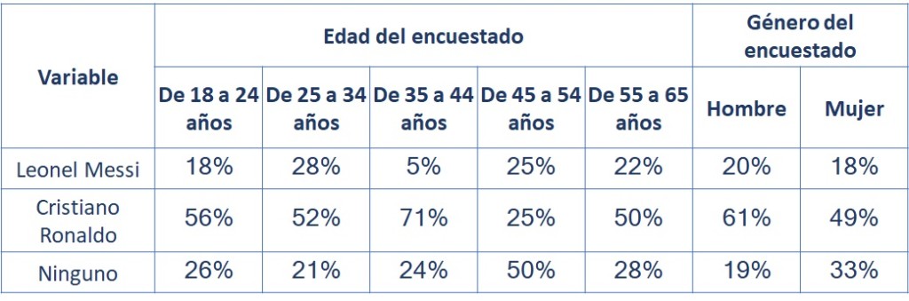 • Las personas que afirman ser hinchas de Barcelona, tienen un empate técnico sobre a qué jugador traerían a su equipo, en donde Lionel Messi solamente supera a Cristiano Ronaldo en un 2%.